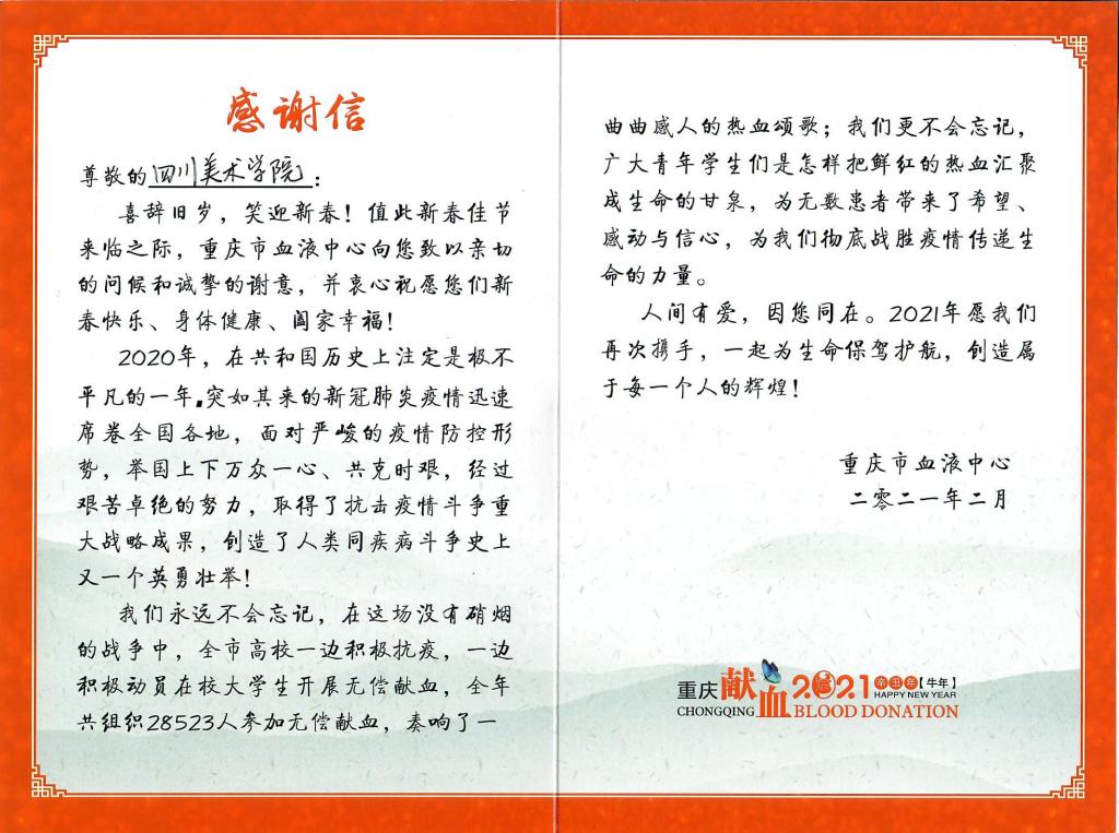 2021年2月,重庆市血液中心向我校发来感谢信,信中提到:“面对严峻的疫情防控形势,举国上下万众一心、共克时艰。全市高校一边积极抗疫,一边积极动员在校大学生开展无偿献血,把献血汇聚成生命的甘泉,为我们彻底战胜疫情传递生命的力量。”